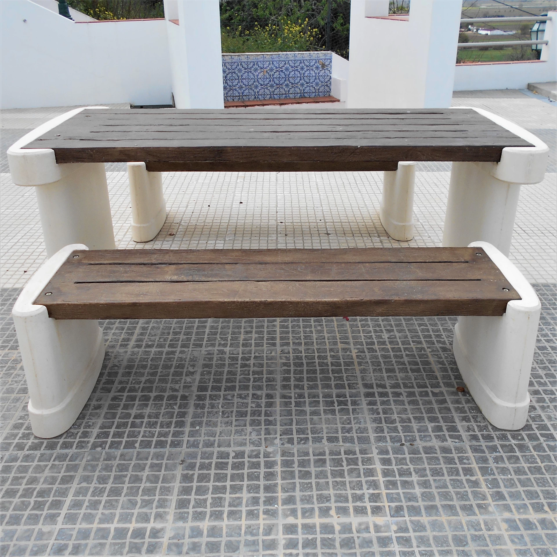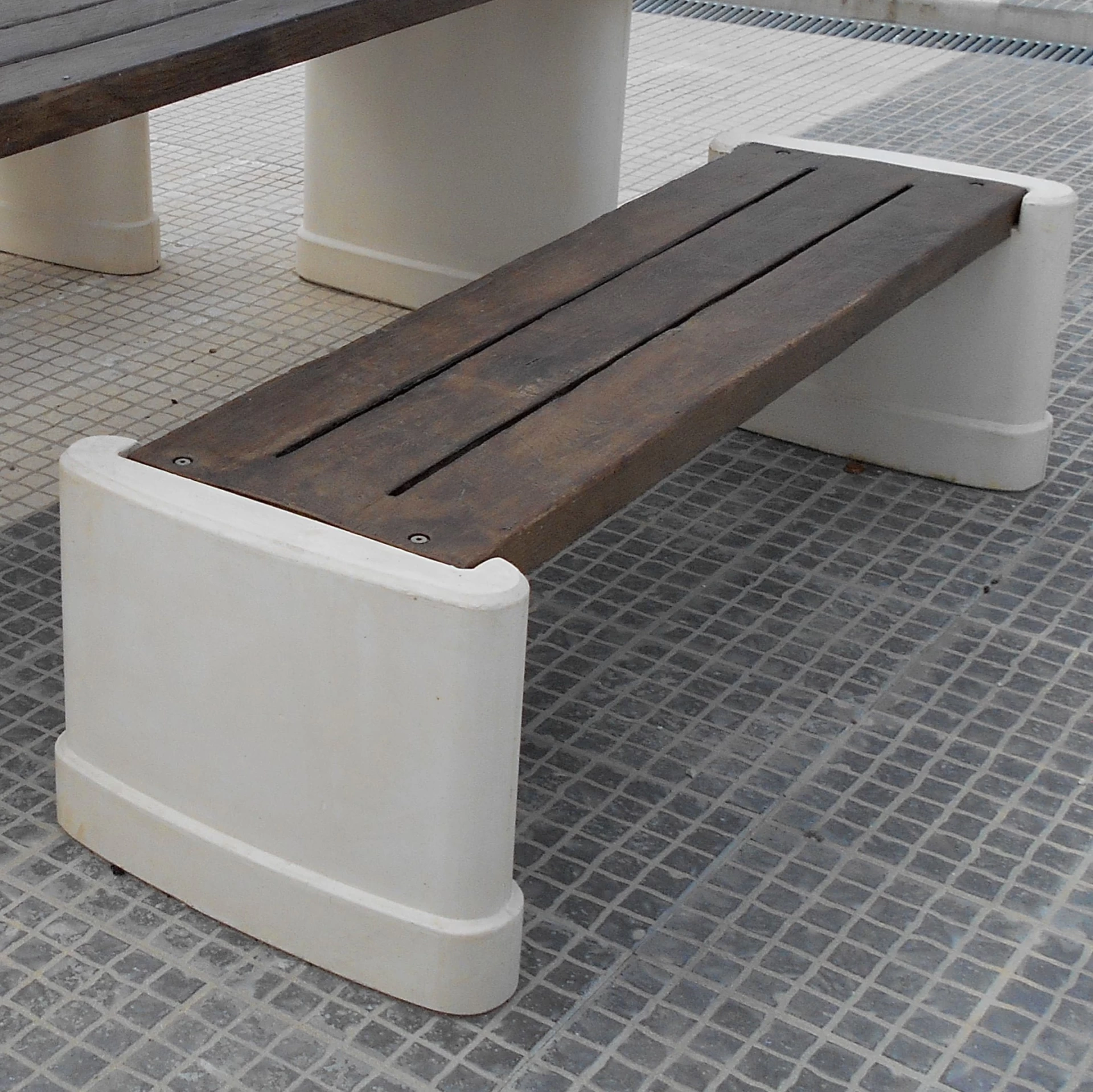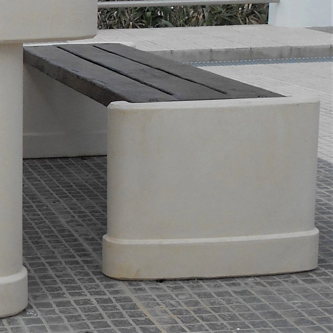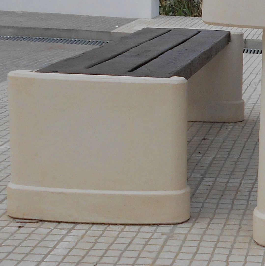 Sus elementos contrastados le confieren un innegable aspecto rústico. Está formado por patas ovaladas que discurren verticalmente y un asiento de tablones de hormigón que parecen tablones de madera.