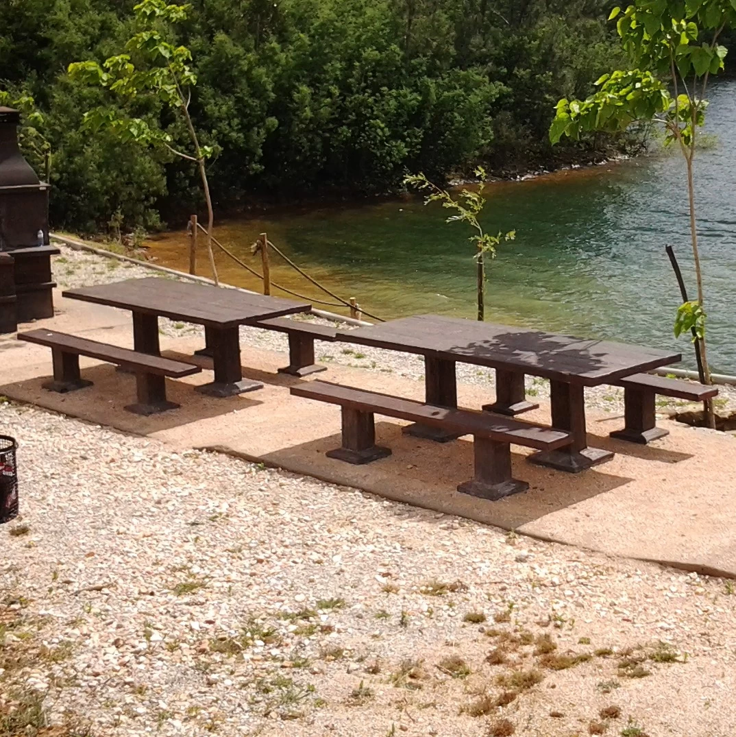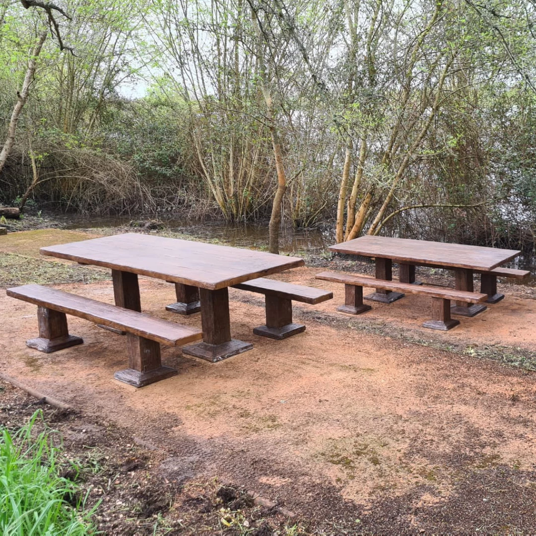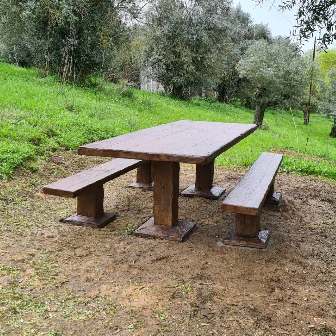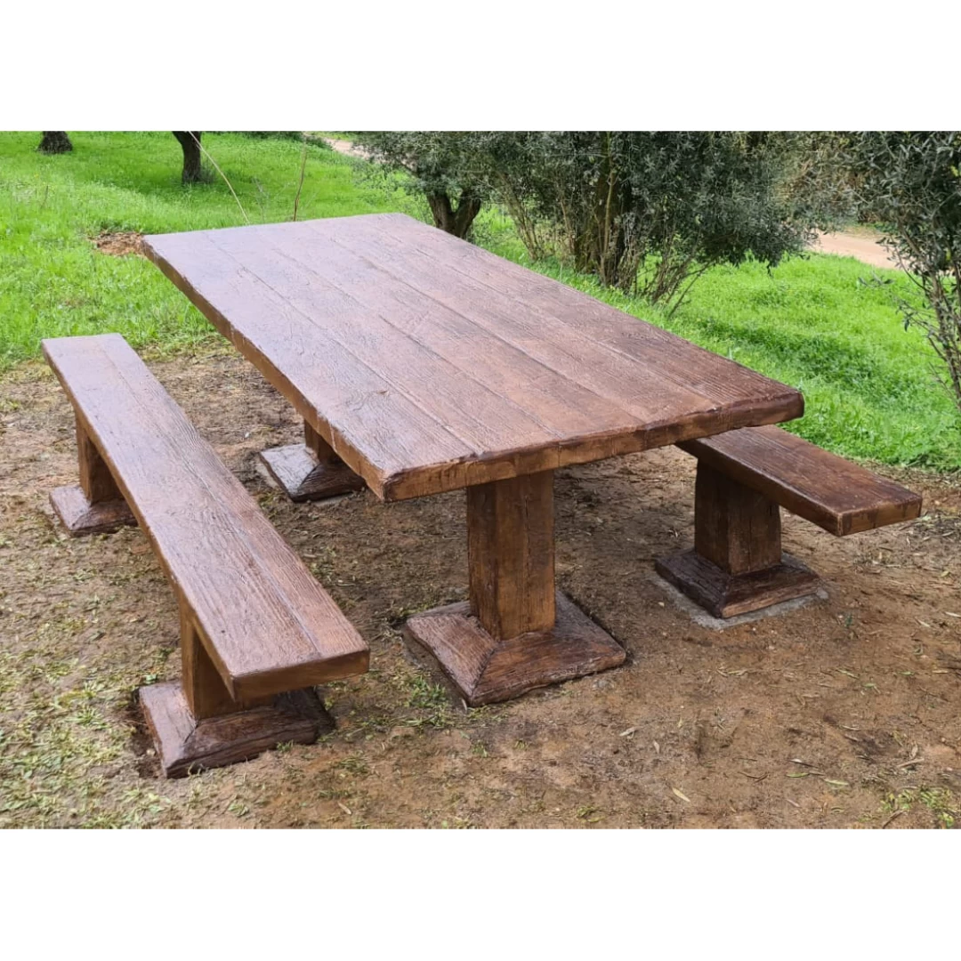 Un ensemble préfabriqué en béton avec une texture bois, comprenant 1 table et 2 bancs collectifs.